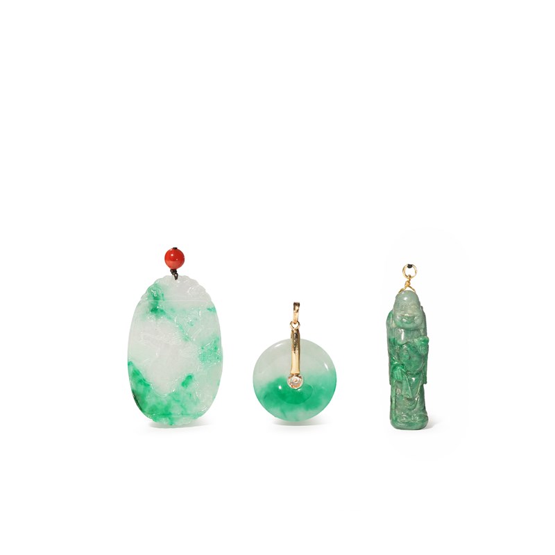 THREE CHINESE JADEITE PENDANTS MODERN One a bi disc mounted with a gold loop and a paste stone