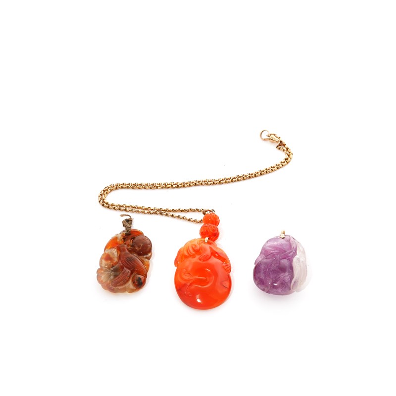 Comprising: an amethyst pendant formed as two peaches, an agate pendant carved in openwork with a pheasant amongst fruit and foliage, and a carnelian agate pendant carved as a mythical beast seated atop a bi disc, adorned with two beads incised with shou characters and suspended by a gold chain, 7.2cm. (3)
