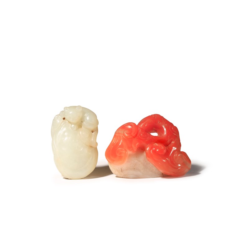 The carving formed as three lingzhi, with two picked out in an orange section of the stone, the jade carved as a small cat lying amidst lingzhi, the stone with some white mottling and russet markings, 6.1cm. (2)