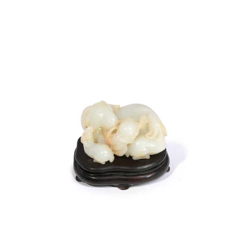 A CHINESE PALE CELADON JADE GROUP OF THREE RAMS QING DYNASTY OR LATER Carved as a large recumbent...