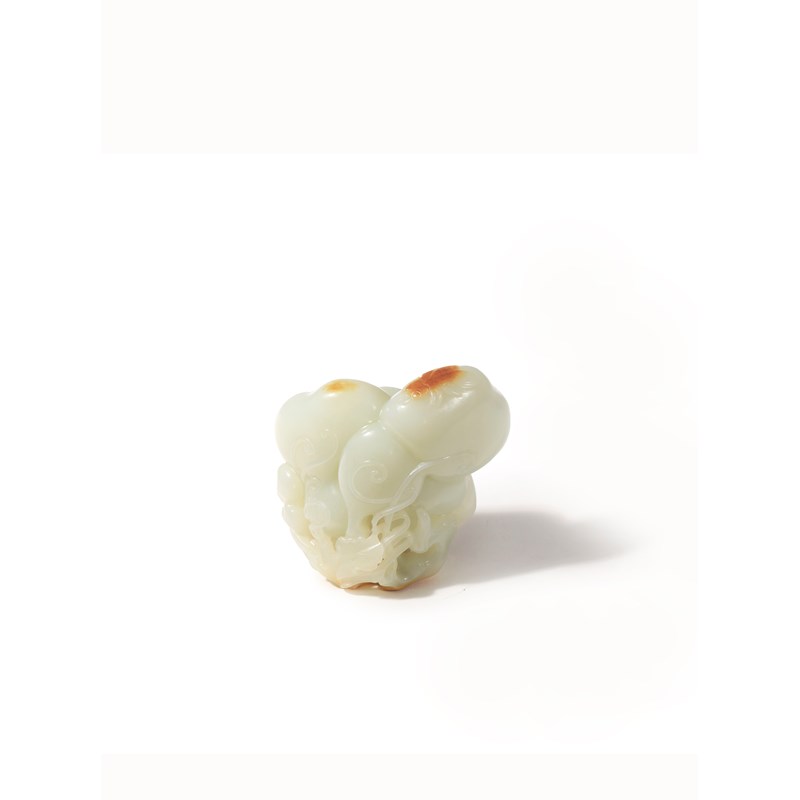 Formed as many fruits issuing from a leafy branch, with vines falling and twisting around them, carved with an insect to the underside of the largest gourd, the stone with some russet inclusions, 8.4cm.