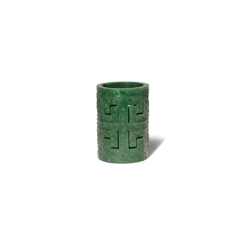 Of cylindrical form, carved in openwork with an interlocking fret design of 'T' segments, decorated with archaistic whorls and C-shaped scrolls in shallow relief, 12cm.