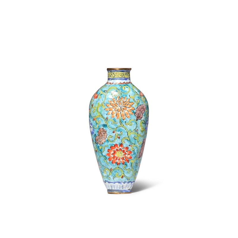 A CHINESE ENAMEL TURQUOISE-GROUND SNUFF BOTTLE 18TH CENTURY The flattened ovoid body rising to a...