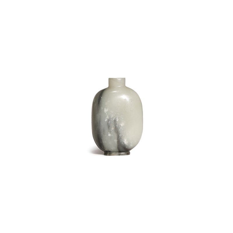 A CHINESE PALE CELADON AND GREY JADE 'THREE FRIENDS OF WINTER' SNUFF BOTTLE