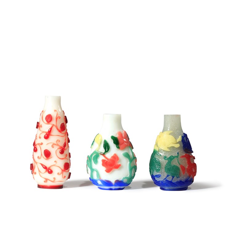 One carved through red glass to a white ground with gourds and leaves, another decorated with a bird amongst flowers in various colours over a white ground, the third carved with waterfowl in six colours against a clear bubble-suffused ground, 8cm. (3)