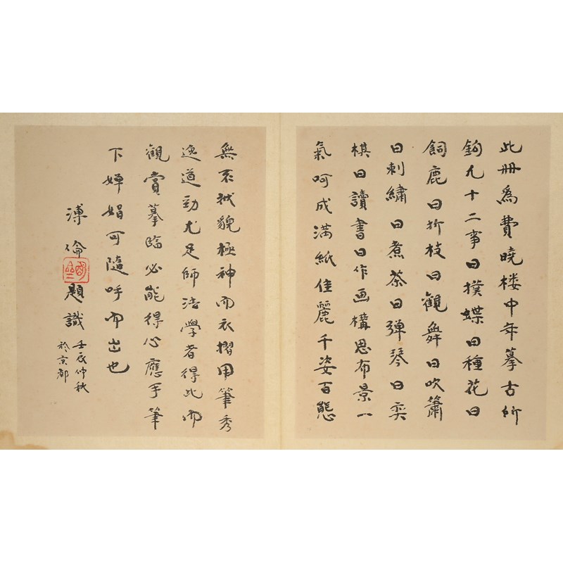 此冊為費曉樓中年摹古所鈎之,凡十二事曰撲蝶,曰種花,曰飼鹿,曰折枝,曰觀舞,曰吹簫,曰刺繡,曰煮茶,曰彈琴,曰弈琴,曰讀書,曰作畫構思佈景一氣呵成滿紙佳麗千姿百態,無不㧔貌極神而衣褶用筆秀逸道勁尤足,師法學者得此而觀賞摹臨必能得心應手,筆下嬋娟可隨呼而出也,溥論題識,壬辰仲秋於京都。