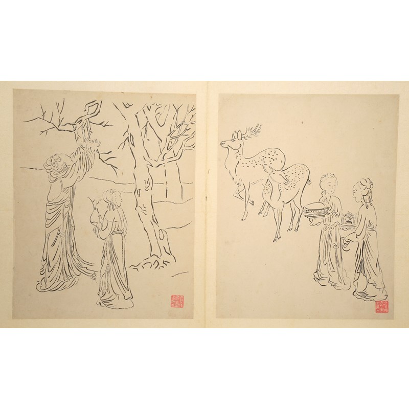 A Chinese album of paintings, ink on paper, title-slip by Pu Lun, which reads Fei Dan Xu bai miao ren wu ce ye, signed Xiao Lou Fei Dan Xu with thirteen artist's seals, inscription by Pu Lun with one artist's seal, mounted as an album of fourteen leaves, each 25cm x 20cm.