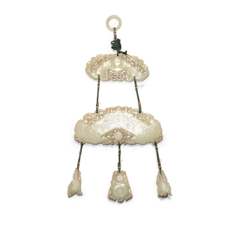 Composed of five carvings, one formed as a bat, the largest incised with the Bajixiang and carved with two dragons, two formed as flowerheads and another as a gourd incised with the characters da ji, all suspending from a ring, 14.3cm widest.