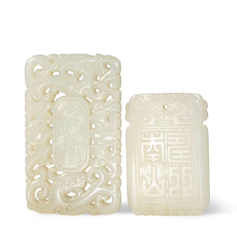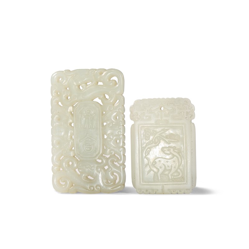 TWO CHINESE JADE RECTANGULAR PENDANTS QING DYNASTY One white jade