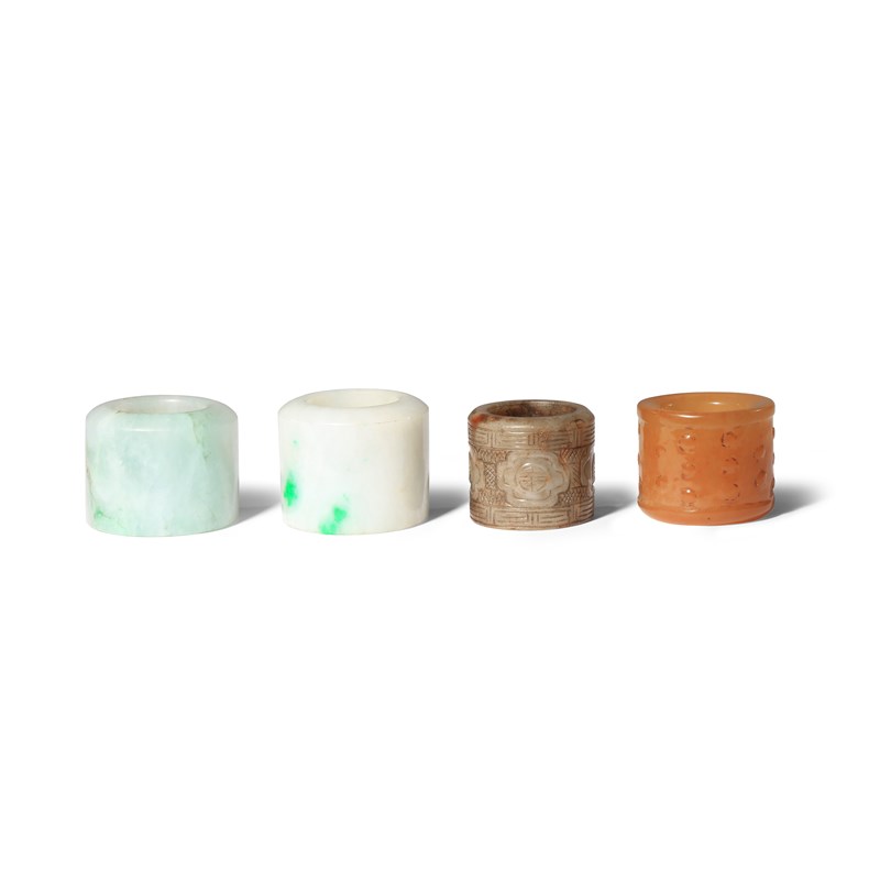 清 青白玉、翡翠及瑪瑙雕扳指 一組四件