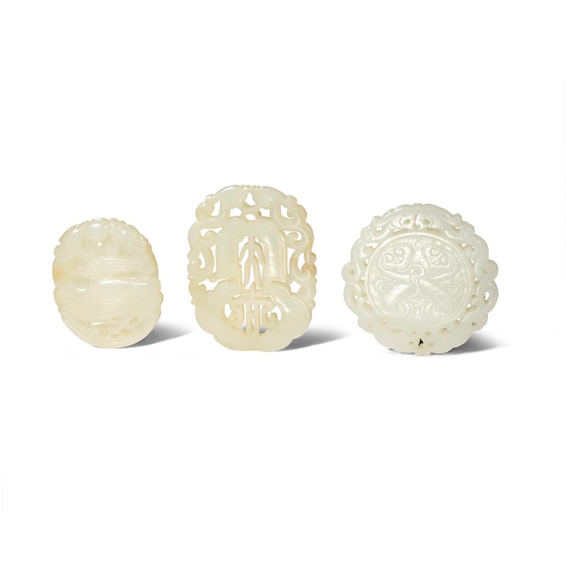 Two pale celadon jade, one carved in openwork with stylised dragons above characters reading da ji, the other worked in shallow relief with a dragon and phoenix, one side incised with characters, the third white jade and decorated to one side with a pair of ruyi-sceptres, with shuangxi characters to the reverse, surrounded by sinuous dragons, 6.4cm. (3)