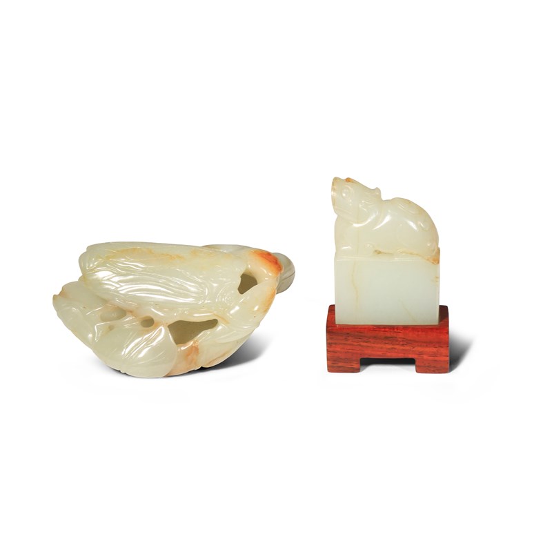 清 青白玉雕蟬及獅鈕方章 一組兩件