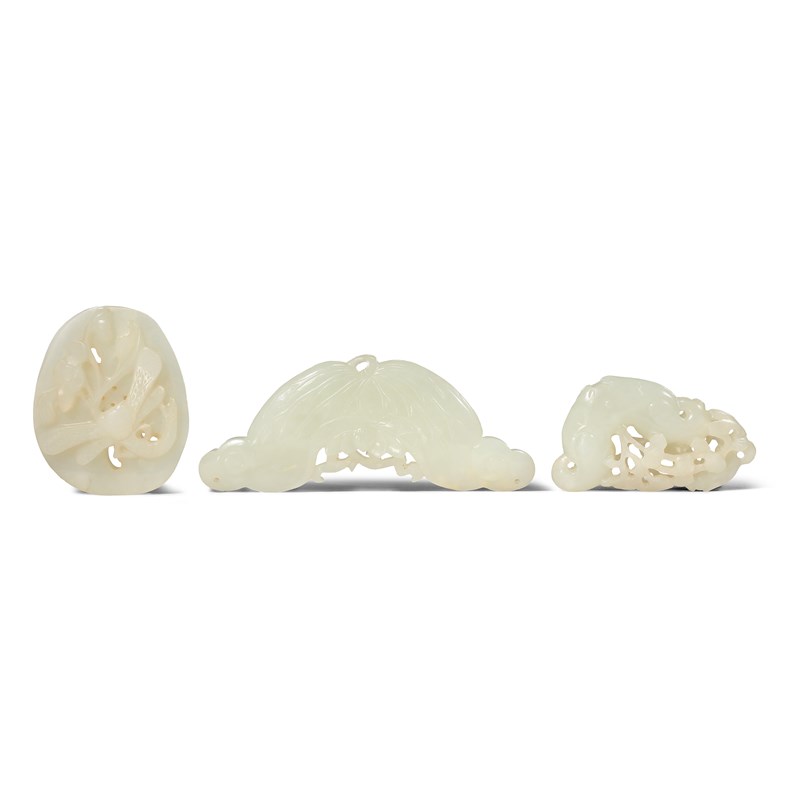 THREE CHINESE PALE CELADON JADE PENDANTS QING DYNASTY One carved as a dragonfly and flower on a...