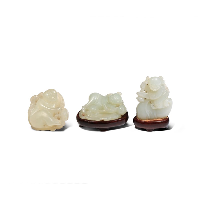 Two pale celadon jade, one carved as a child lying atop a large leaf, the other depicting a monkey holding a peach as a smaller primate clambers on its back, the third white jade and formed as a figure seated upon a large fruit, two with wood stands, 4.7cm. (4)
