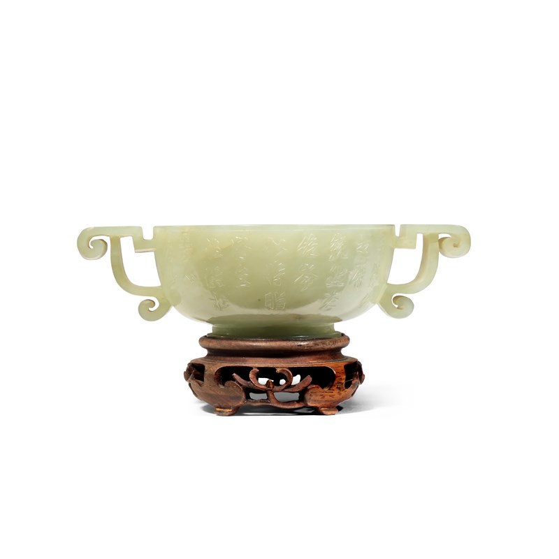 A CHINESE TWO-HANDLED PALE CELADON JADE CUP QING DYNASTY Each side carved in shallow relief with...
