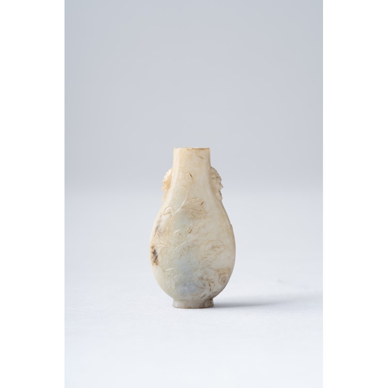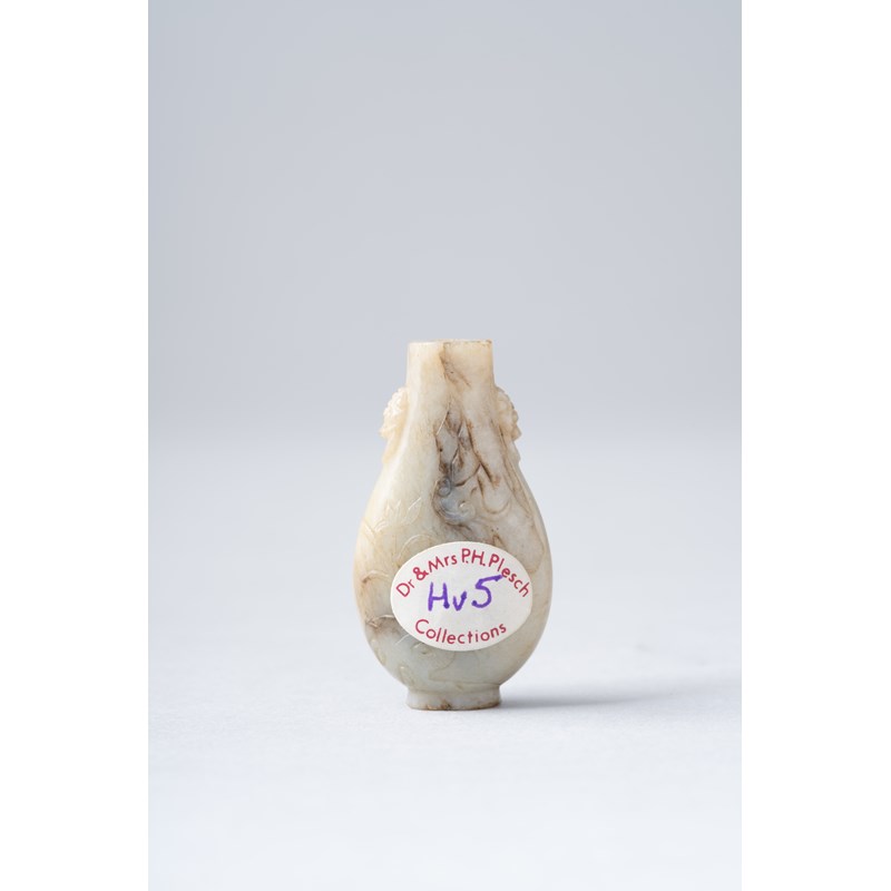 The bottle of flattened pear-shape, carved with small lion-mask and fixed ring handles, and with flower sprays and rockwork around the vessel, above an oval ring foot, the stone with areas of darker markings, with a paper label for Dr and Mrs P H Plesch Collections, no.Hv5, 4.8cm.