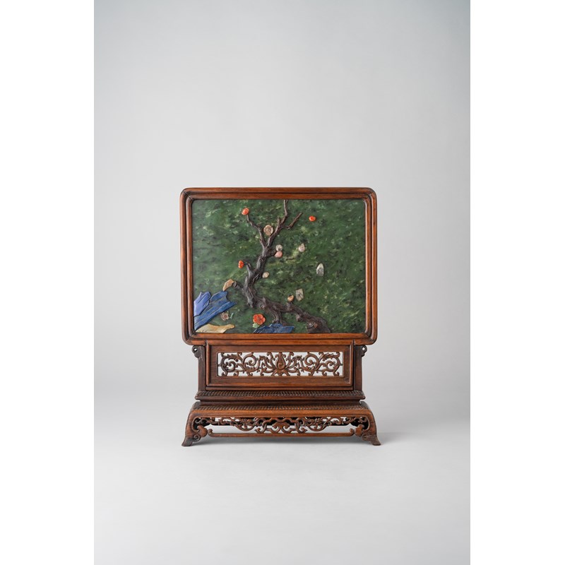 One side inlaid with colourful soapstone, quartz and hardwood depicting a gnarled prunus tree and rockwork, the other side incised with sixty shou characters, mounted in a hardwood frame with reticulated foliage designs, 20cm x 26cm, 38.5cm overall. (2)