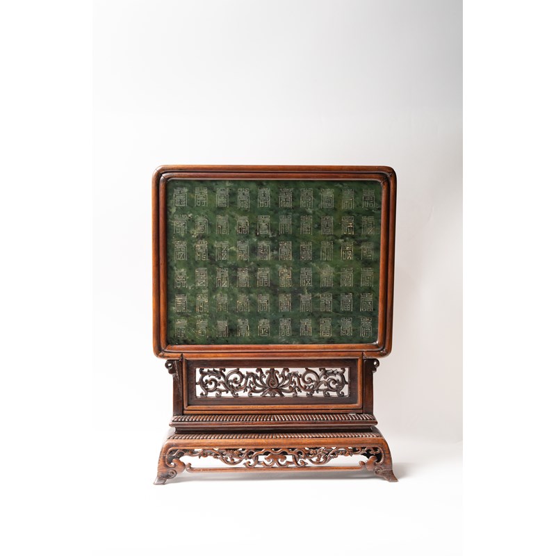 A CHINESE RECTANGULAR SPINACH-GREEN JADE TABLE SCREEN