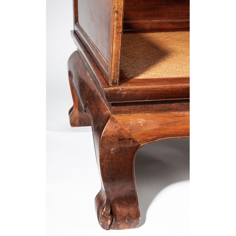 The base of mortise and tenon construction with dropped U-shaped aprons to the sides and inset to the top with woven matting, the five separate back and side panels tenoned into the seat frame with a frieze of kui-dragons decorating the central panel, all raised on four ogee bracket feet each carved with a foliate-capped ball in high relief, 199cm x 92cm x 82cm overall, the base 82cm high. (6)