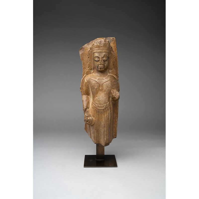 The figure carved in high relief, depicted standing with the right hand by the waist holding an indistinct attribute, the face with a serene expression and downcast eyes, wearing a stylised robe folded across the waist and looped over the right shoulder, adorned with a beribboned headdress and a necklace centred with a pendant, the stone with a deep beige patina, together with a metal stand, the base with a paper label reading 'Eskenazi London C4850', 38.5cm. (2)