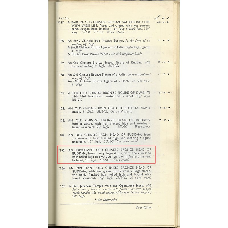 With a meditative expression defined by her downcast eyes beneath delineated eyebrows, framed by prominent earlobes, her hair piled high and secured by a headpiece with a seated figure, probably Amitabha, together with a wood stand and the Storey, Sons & Parker auction catalogue, 12kg, 47cm. (3)