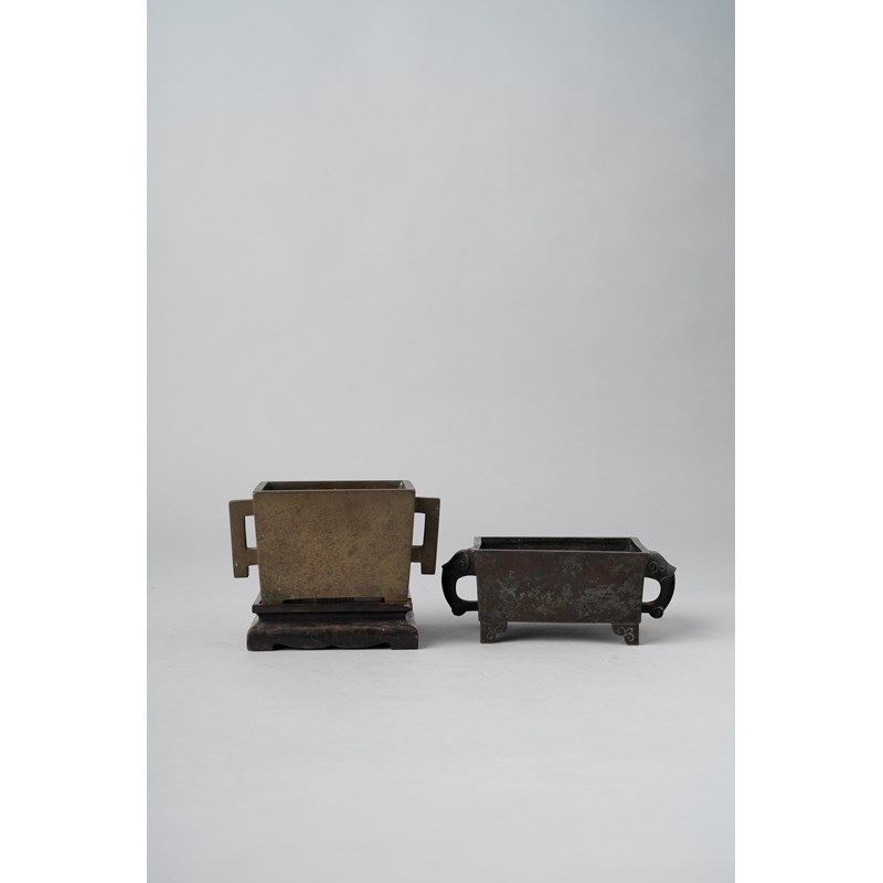 Of tapering rectangular form with loop handles to the sides, the base with a four-character seal mark reading Yan Di Shi zhi, together with a wood stand; and another bronze incense burner of rectangular form with a flared rim and loop handles to the sides issuing from stylised mythical beast masks, the base with a six-character Xuande mark, 1.3kg and 545g, 14cm and 14.7cm. (3)