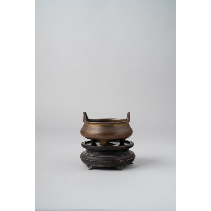 The compressed circular body with two rounded loop handles to the rim, the base with a six-character seal mark, together with a wood stand, 888g, 11.5cm. (2)
