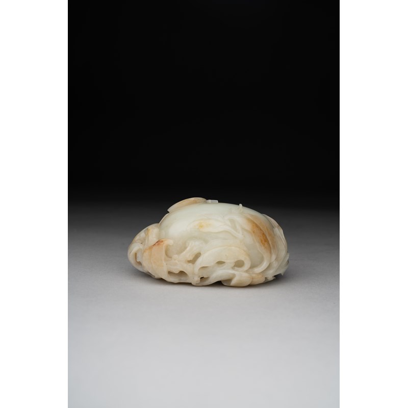 Carved as two pomegranates issuing from a leafy stem, each fruit carved with a finely defined calyx, a small cicada clambering amidst the foliage and the underside of the larger fruit peeled to reveal the many hexagonal seeds within, the stone with light mottling and scattered instances of russet veining, 9.5cm.