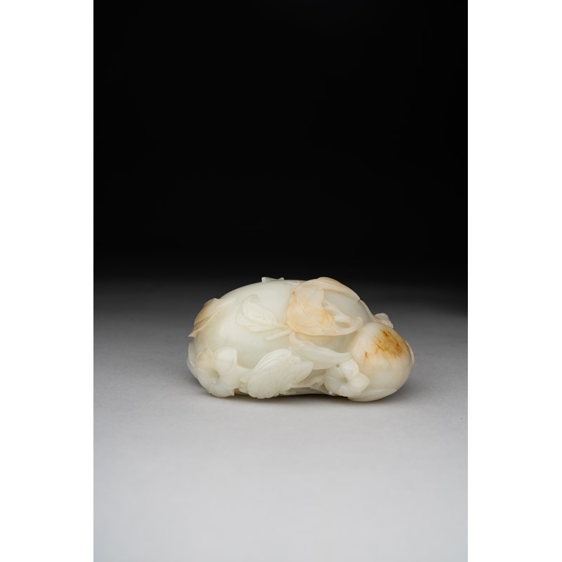 The pomegranate is an auspicious motif in China, its many seeds making it a symbol of fertility and abundance. The fruit is often depicted with a section of skin peeled back to show the numerous seeds inside, as seen in the piece offered here. This image forms the rebus liukai baizi, or 'the pomegranate opens revealing one hundred sons', conveying the wish for many offspring. For a related white jade pomegranate carving, see the Compendium of Collections in the Palace Museum: Jade, vol.9, p.172, no.162. The additional element of the cicada further enhances this meaning, as the image of the insect high up in tree canopies emitting its calling song is referred to as yiming jingren, comparing it to someone unknown who goes on to achieve great fame with an impressive feat. Hence, the piece offered here also carries the connotation of wishing that those many sons may go on to achieve greatness in their lives.