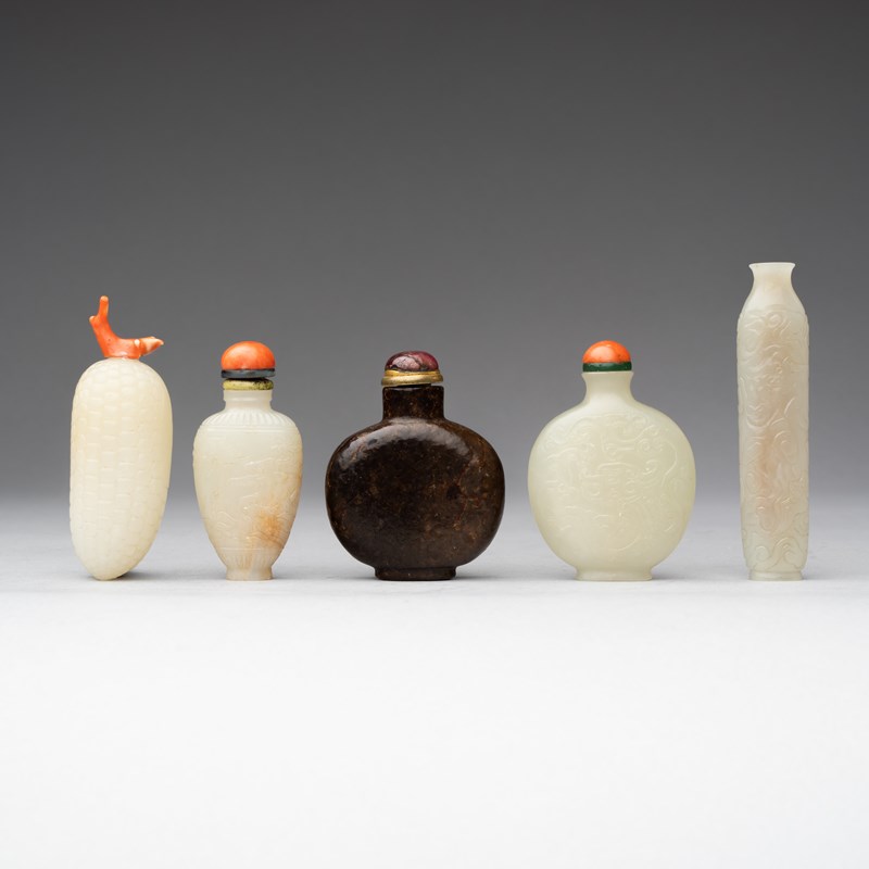 Four in pale celadon jade, one carved in relief as a corn cob, another carved with bats amongst stylised clouds, a third carved with a crane flying above a rocky landscape, the fourth carved with a stylised chilong, the fifth in a mottled brown hardstone.