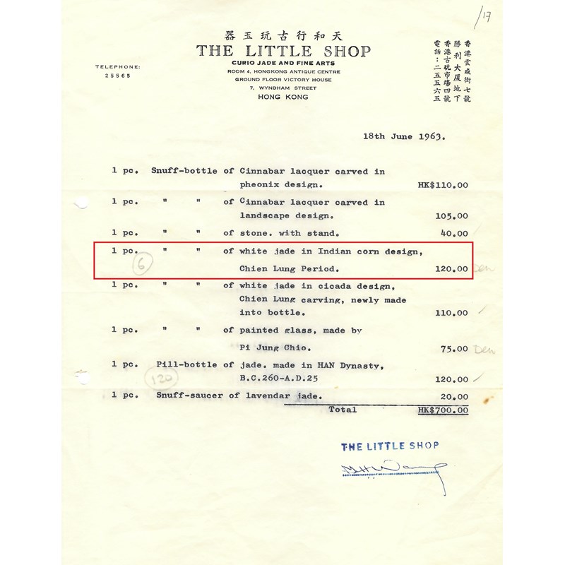 The corn-shaped bottle with a copy of an invoice for The Little Shop, dated 1963.