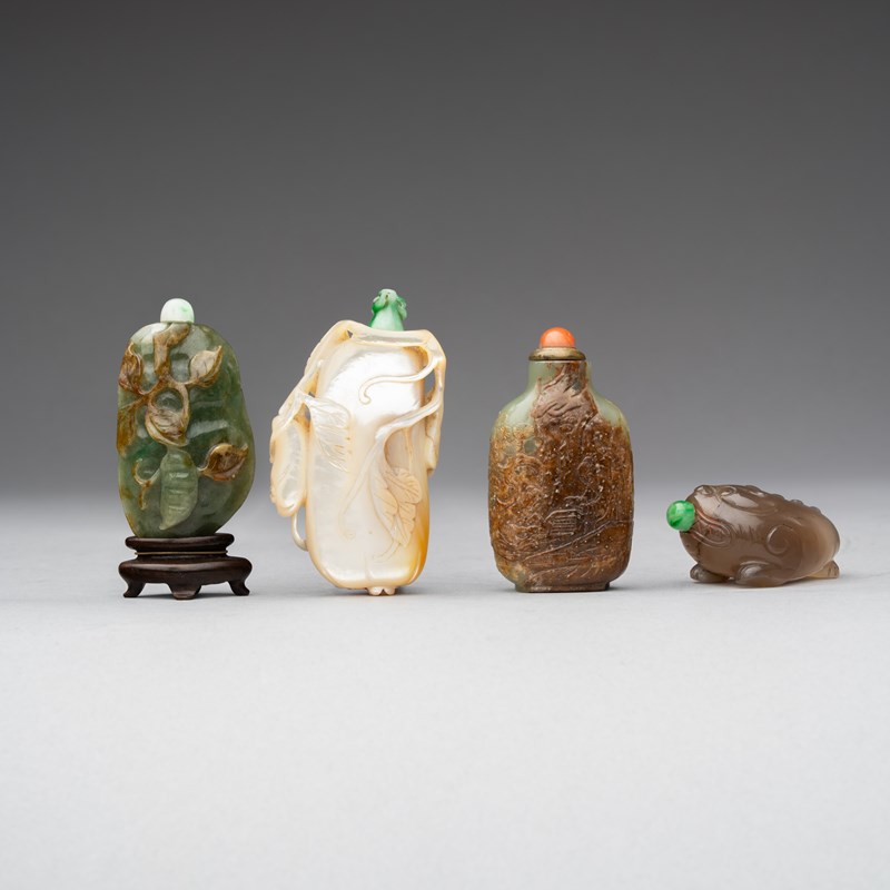 One in yellow and brown jade carved in relief with two scholars playing weiqi, another in jadeite carved as a peapod, with a wood stand, a third in agate carved as a three-legged toad, the fourth in mother of pearl carved as a melon.