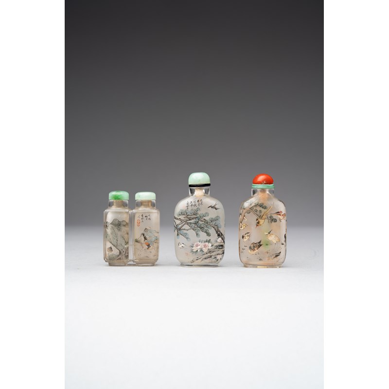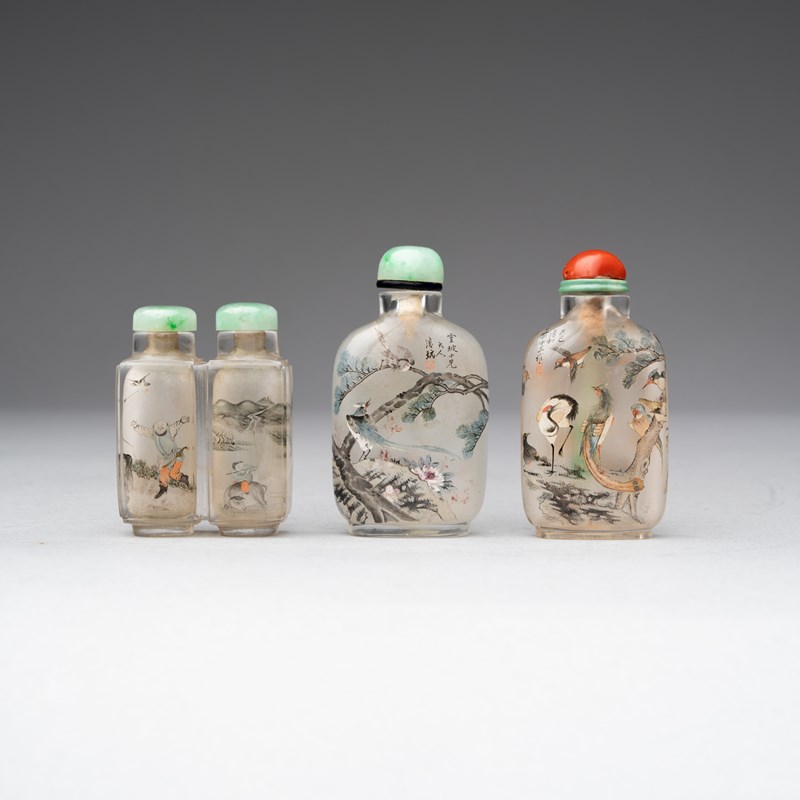 The first a conjoined rock crystal bottle dated the wuxu year (1898), decorated with figures on riverbank and a hunting scene; another dated the yisi year (1905), painted with paradise flycatchers and swallows amidst pine trees; a third dated the jisi year (1929) with decorated with the 'Hundred Birds' motif.