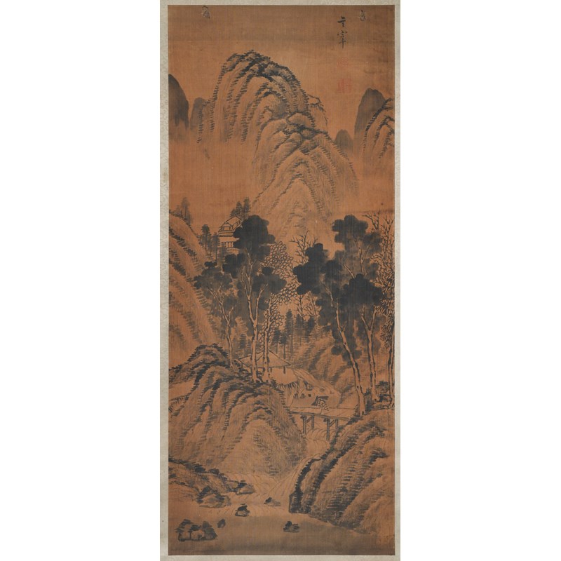 A Chinese scroll painting, ink and colour on silk, signed Xuan Zai, with two artist's seals, which read Chang and Taishi yin.