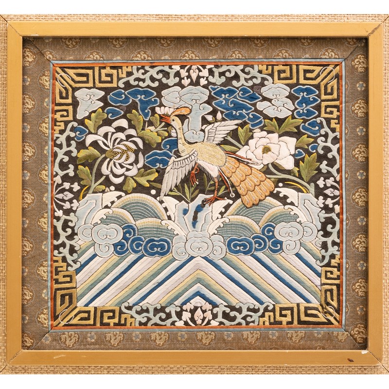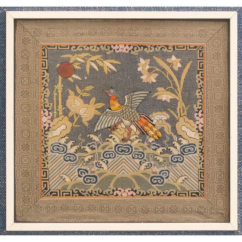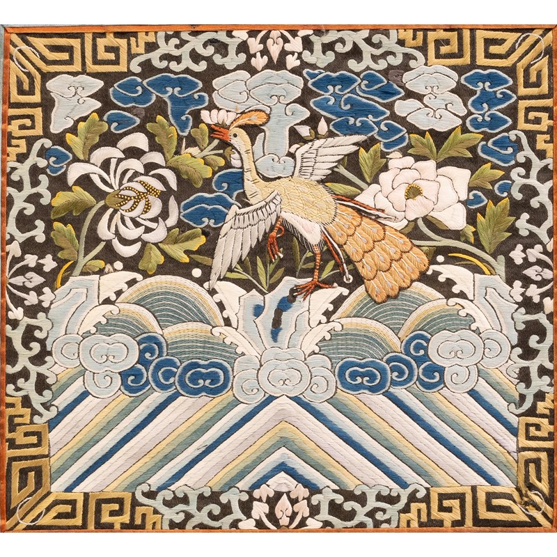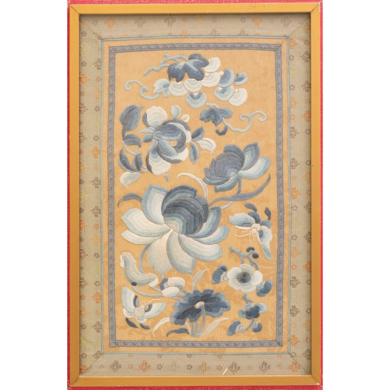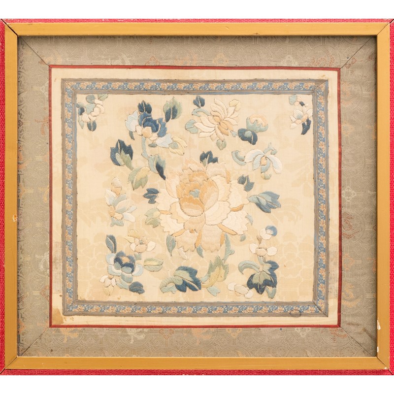 TWO CHINESE RANK BADGES AND TWO FLORAL EMBROIDERED PANELS