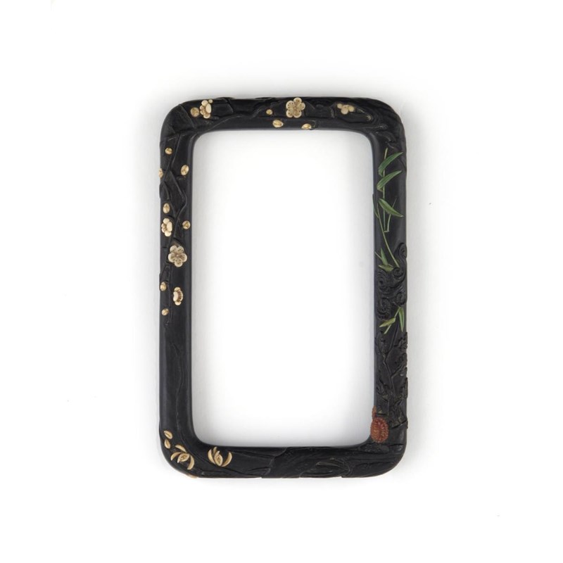 λ A Chinese hardwood frame 19th century, carved with chrysanthemum, prunus, lingzhi and bamboo, and inlaid with soapstone and ivory stained in green and red, signed Wang Chuan to one corner, 15.2cm.