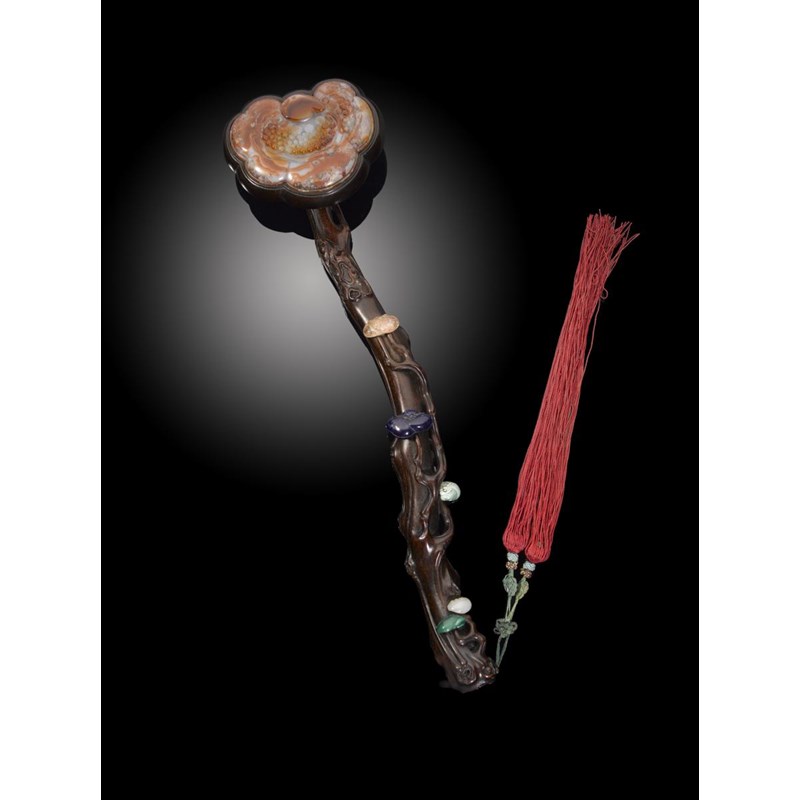 A good Chinese zitan ruyi sceptre probably late Qing dynasty, the head inset with an agate plaque carved in relief as a lingzhi fungus, the shaft carved as a gnarled branch from which further fungi grow in malachite, turquoise, lapis lazuli and other hardstones, together with a fitted hardwood box, 40.5cm.