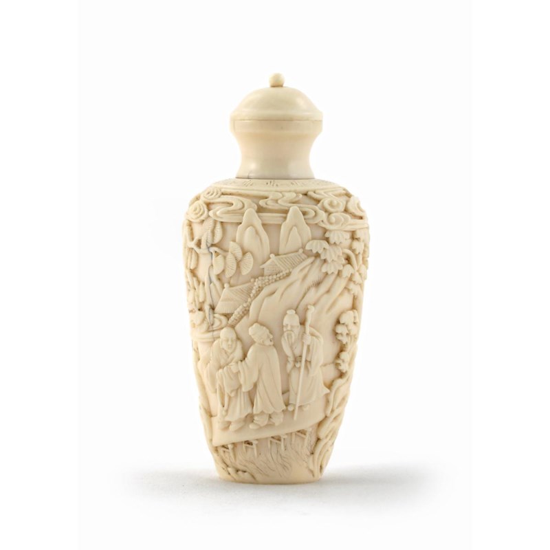 λ A good Chinese ivory snuff bottle 19th century, carved in relief depicting Yu Boya visiting Zhong Ziqi to discuss the music of qin before a mountainous landscape and a pagoda, with pine and clouds, a band of key fret to the shoulder, 9cm.