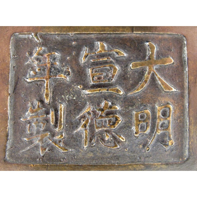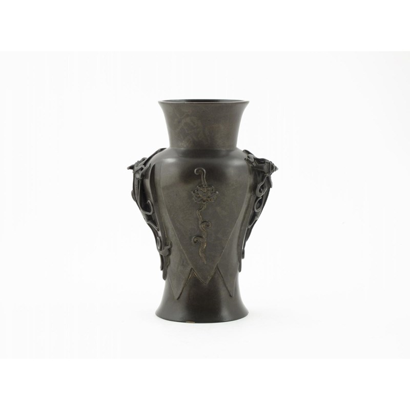 A Chinese cast bronze baluster vase 18th/19th century, formed as shield-shaped lappets, two decorated with lotus sprays, the sides with scrolling chilongs, the base with a six character Xuande mark, 21.7cm.