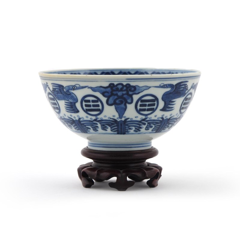 A Chinese blue and white bowl six character Guangxu mark and of the period 1875-1908, painted with the Eight Trigams, divided by flying cranes and stylized clouds above breaking waves, a wood stand, 14cm. (2)
