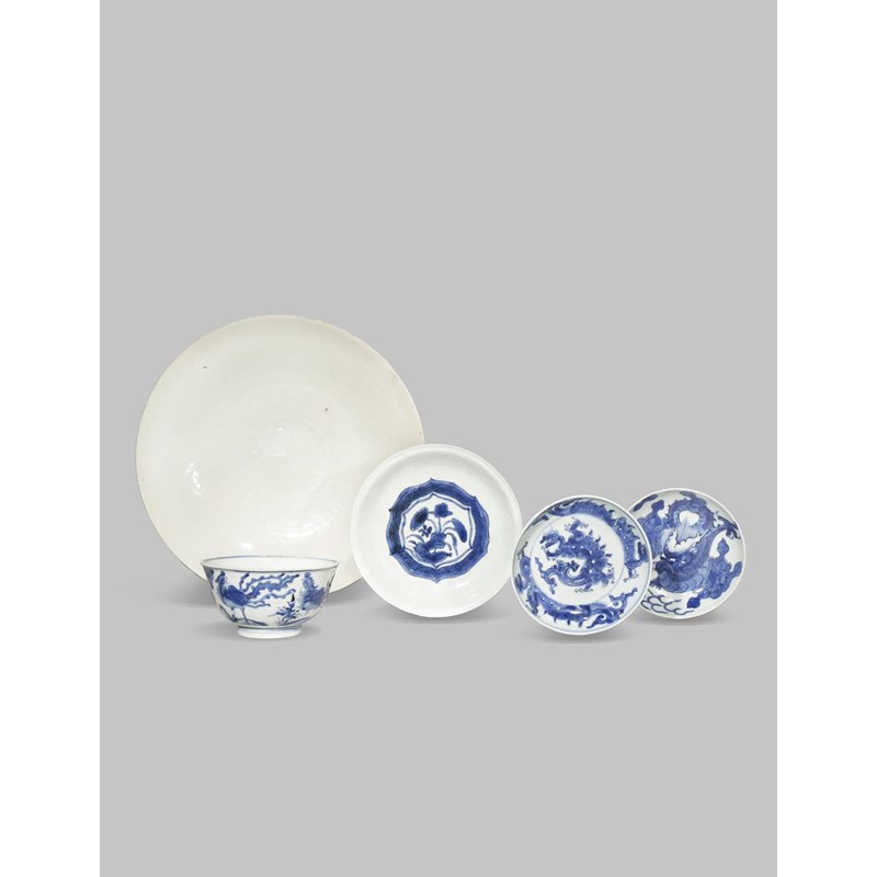 FOUR CHINESE DISHES AND A BOWL 17TH AND 18TH CENTURIES Comprising: a large white glazed Swatow dish