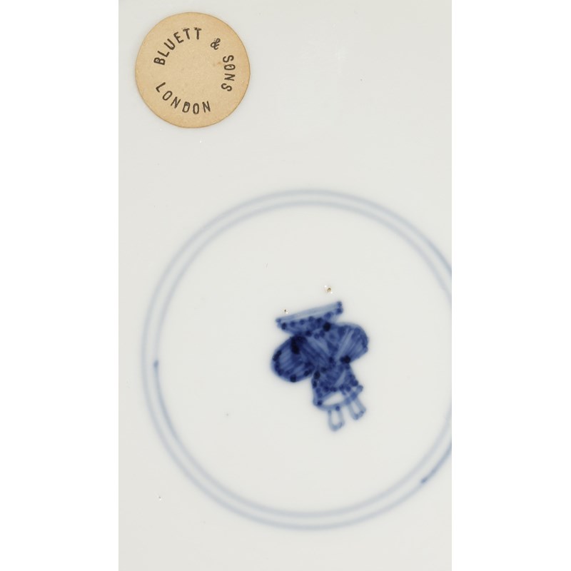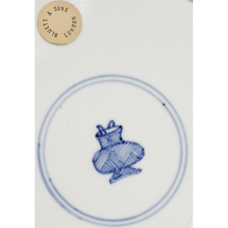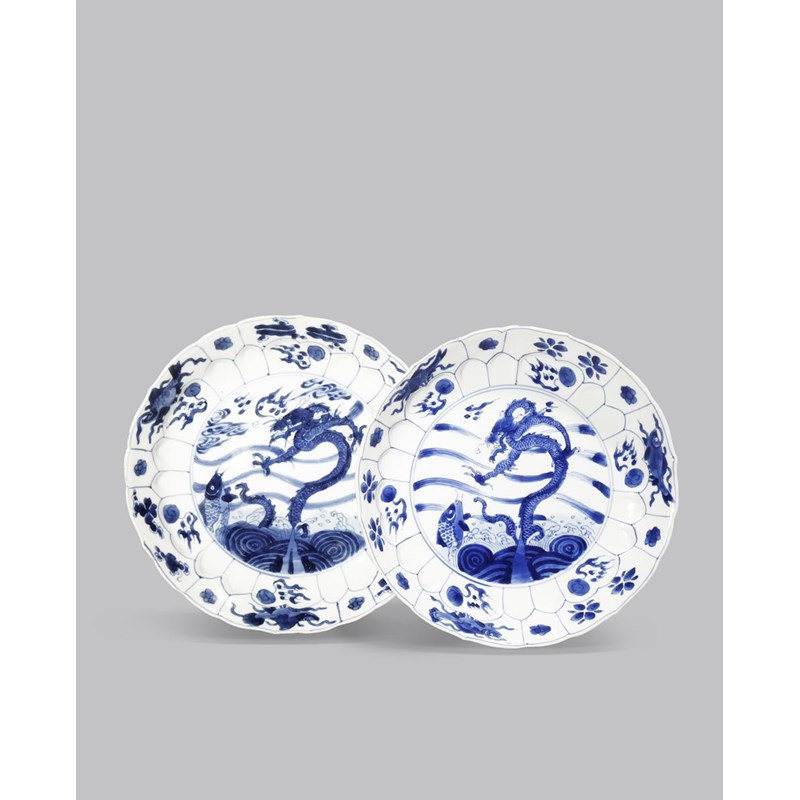 Each painted with a dragon and a carp emerging from swirling waves, the rims moulded as lotus petals and painted with flaming pearls of wisdom, stylised flowerheads and fish, basket-shaped marks and circular paper labels for Bluett & Sons, London, 20.7cm. (2)