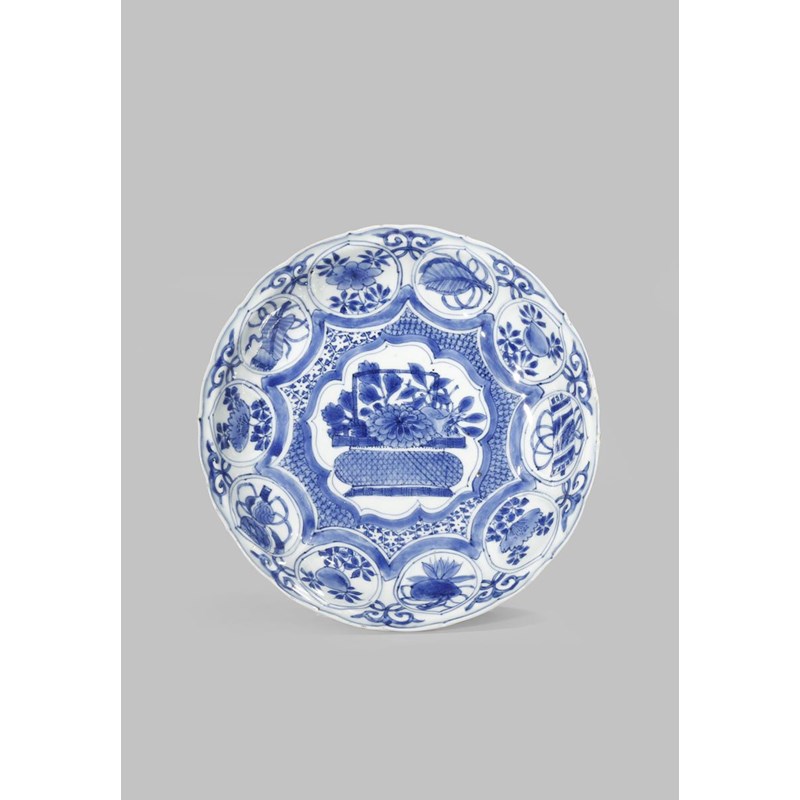 A CHINESE BLUE AND WHITE KRAAK 'FLOWER BASKET' DISH WANLI 1573-1620 Decorated with a flower...