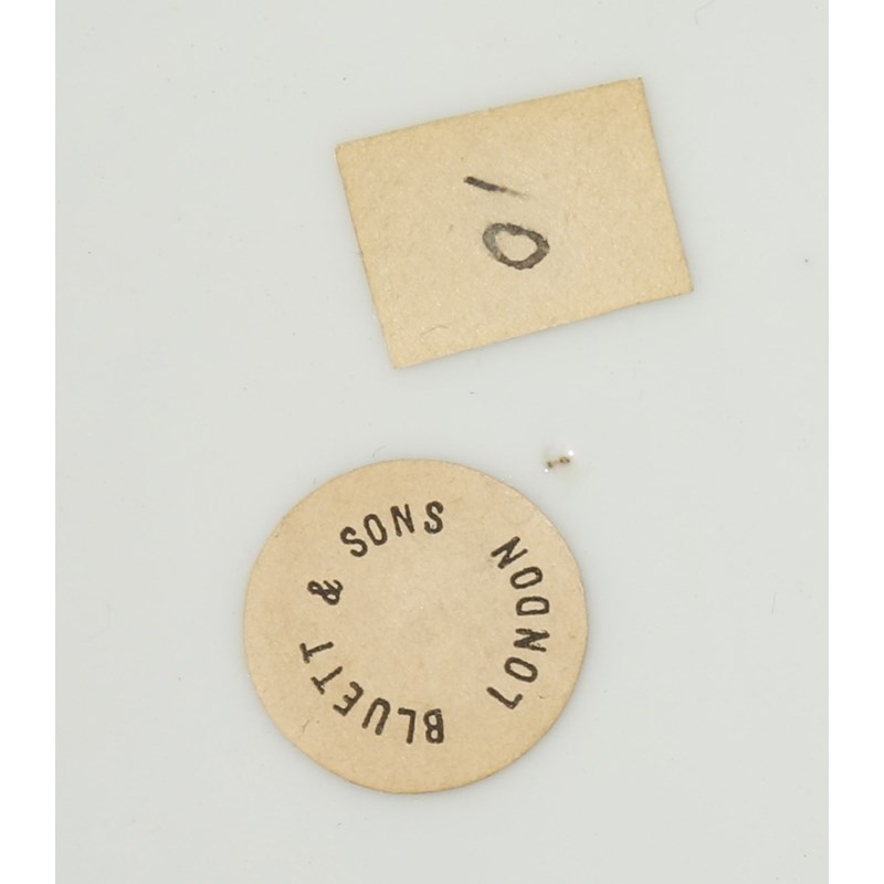 Decorated with a flower basket to the centre on a diaper ground and roundels with blossoms, fruit and precious objects to the rim, a circular paper label for Bluett & Sons, London to the base, 20.2cm.