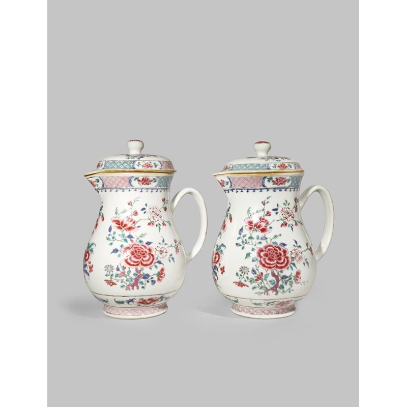 A PAIR OF LARGE CHINESE FAMILLE ROSE JUGS AND COVERS 18TH CENTURY Painted with sprays of peony...