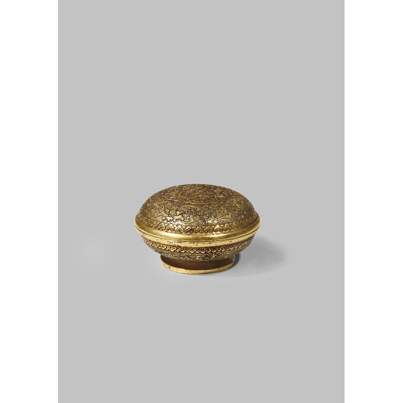 A CHINESE GILT-BRONZE CIRCULAR BOX AND COVER