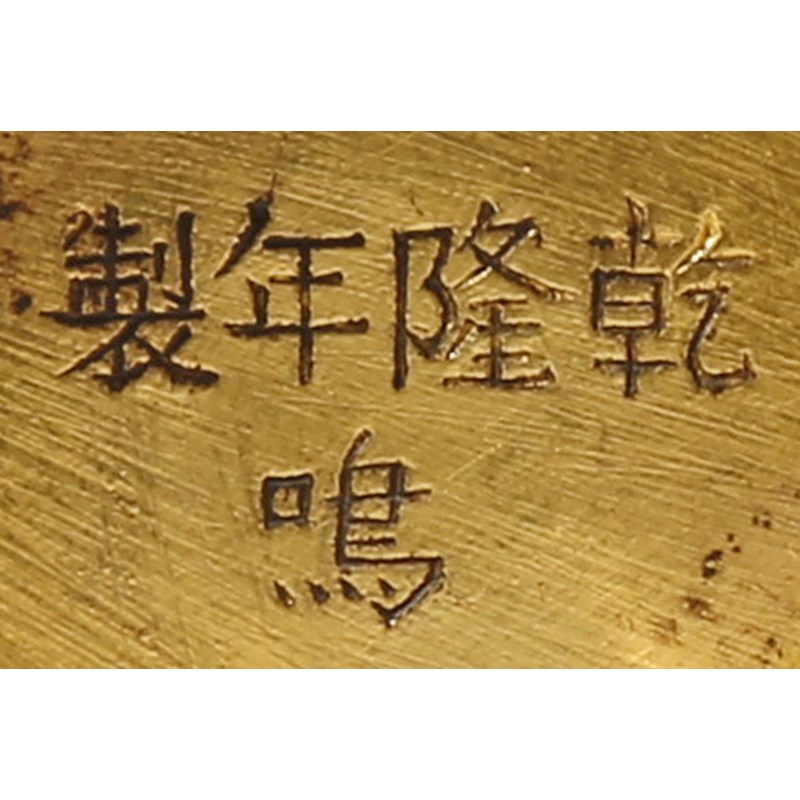 Decorated with stylised lotus flowerheads and scrolling foliage, raised on a short flared foot, a five character Qianlong mark to the base, 5.7cm, 118g. (2)