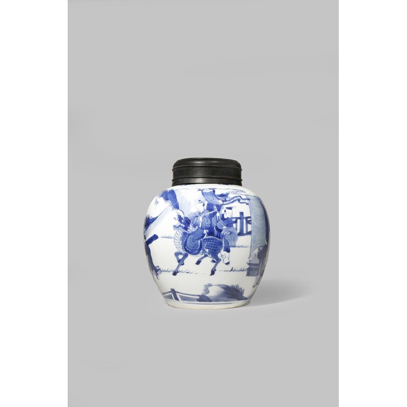 Painted with a continuous scene depicting a young man riding a qilin, signifying his outstanding results in the official examination, together with a wood cover, 17cm. (2)