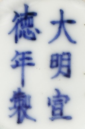 Painted with stylised blossoms and foliage, a band of lappets to the narrow neck and ruyi-heads to the wide rim, a six character Xuande mark to the base, 10.5cm.