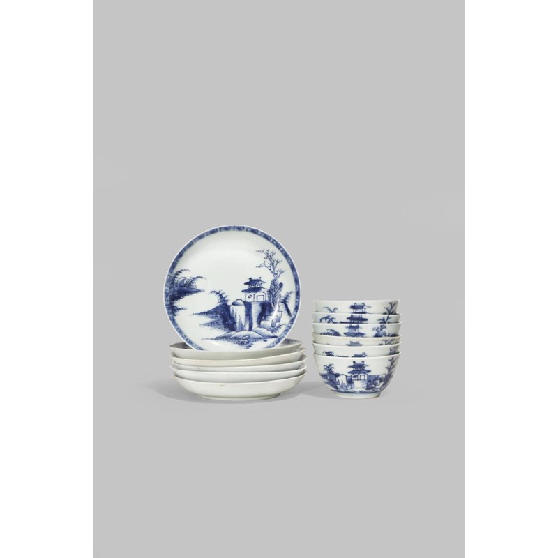 Painted with pagodas in a river landscape, a geometric band to the rims, with circular Christie's labels, 11.7cm. (12)